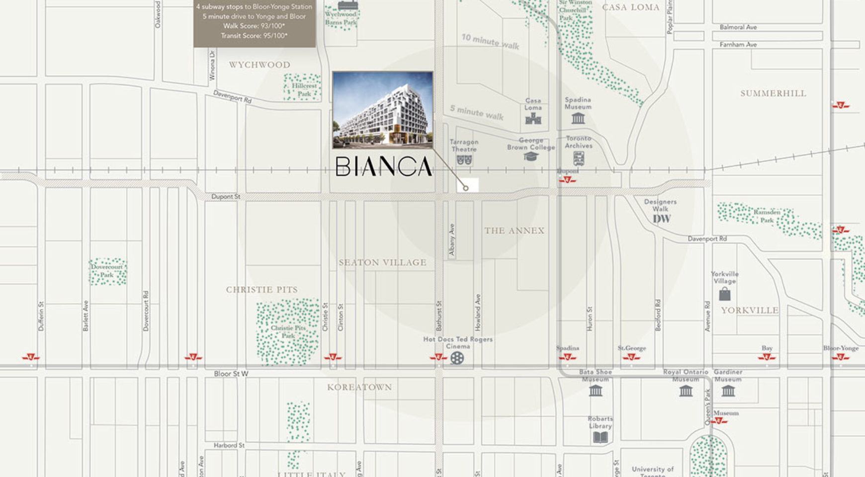 Bianca Condos is Just one block north from Toronto’s Bloor Street overflowing with museums, entertainment, and extravagant shops.